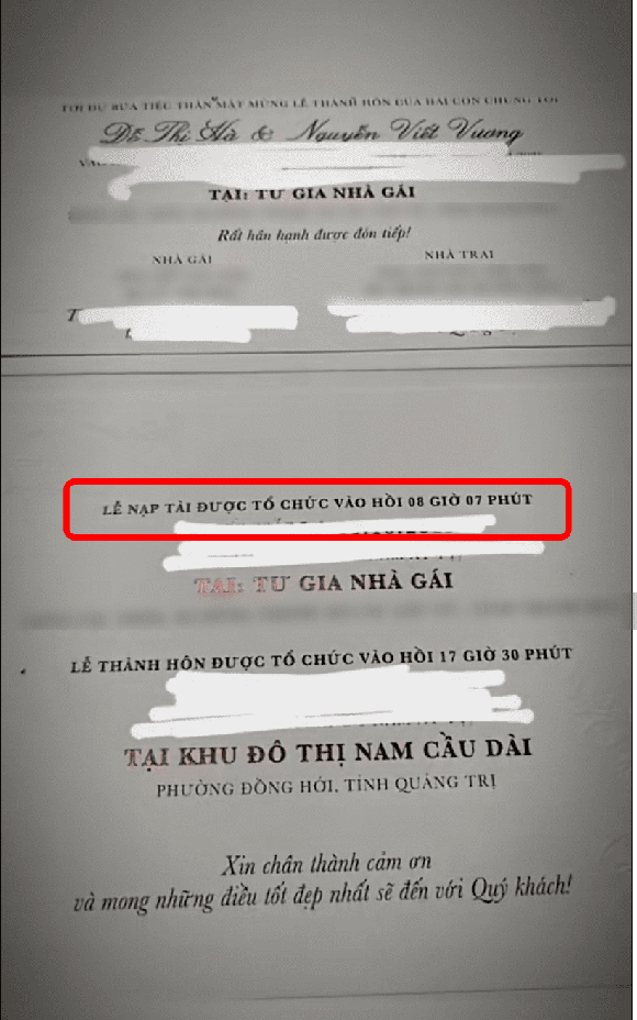 Ngoài ra, một chi tiết gây chú ý chính là giờ cử hành lễ gia tiên của Đỗ Thị Hà và Viết Vương khá khác lạ. Thay vì tổ chức vào những giờ chẵn như thường thấy, cả hai tiến hành nghi lễ vào đúng 8 giờ 7 phút sáng. Tiệc cưới tại Quảng Trị - quê chú rể sẽ diễn ra vào tuần sau.