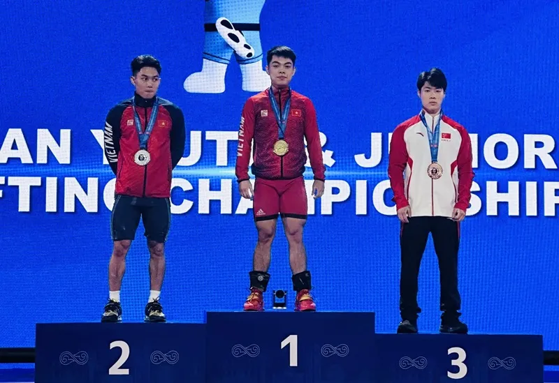 Dương Tuấn Kiệt (giữa) từng giành HCV tại giải cử tạ vô địch trẻ châu Á 2025. Ảnh: NGUYỄN HUY