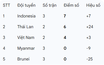 Với kết quả này, tuyển Việt Nam tạm thời đứng thứ ba trên BXH nhưng đang thi đấu ít hơn Indonesia 1 trận. Theo quy định giải đấu, 2 đội đứng đầu vòng bảng thi đấu trận chung kết. Lợi thế trong cuộc đua đến trận đấu cuối cùng đang thuộc về thầy trò HLV Trịnh Hữu Thành.
