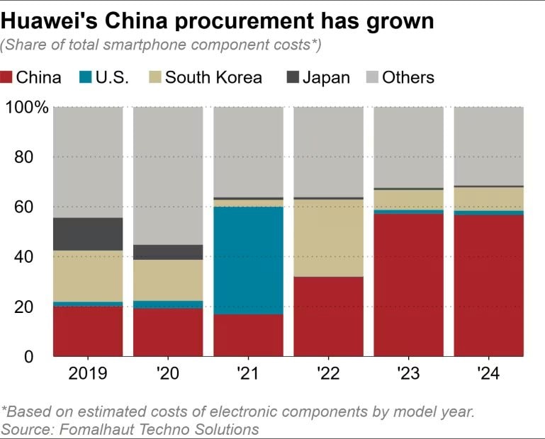 Đối với các điện thoại thông minh Huawei có giá tương đương được ra mắt vào năm 2020, tỷ lệ linh kiện trong nước chỉ là 19%, tăng lên 32% vào năm 2023. Tỷ lệ linh kiện từ Nhật Bản, Mỹ và Hàn Quốc đã giảm hơn 20 điểm phần trăm từ năm 2023 đến năm 2024.