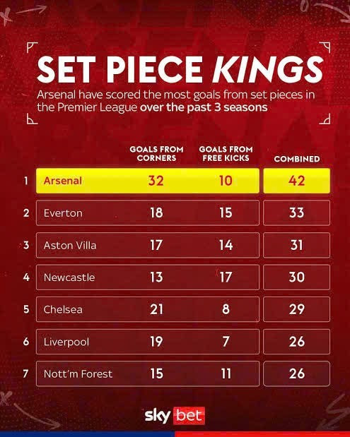 Arsenal hiện là dẫn đầu giải đấu một phần nhờ vào việc làm chủ nghệ thuật bóng chết. Trong 18 bàn thắng tại Premier League, 10 bàn từ đá phạt cố định, 2 bàn từ chấm phạt đền và chỉ 6 bàn là kết quả của các tình huống bóng sống. "Đối thủ biết, nhưng không thể ngăn cản", Mikel Arteta nói, "Đó chính là vẻ đẹp của sự chuẩn bị kỹ lưỡng".