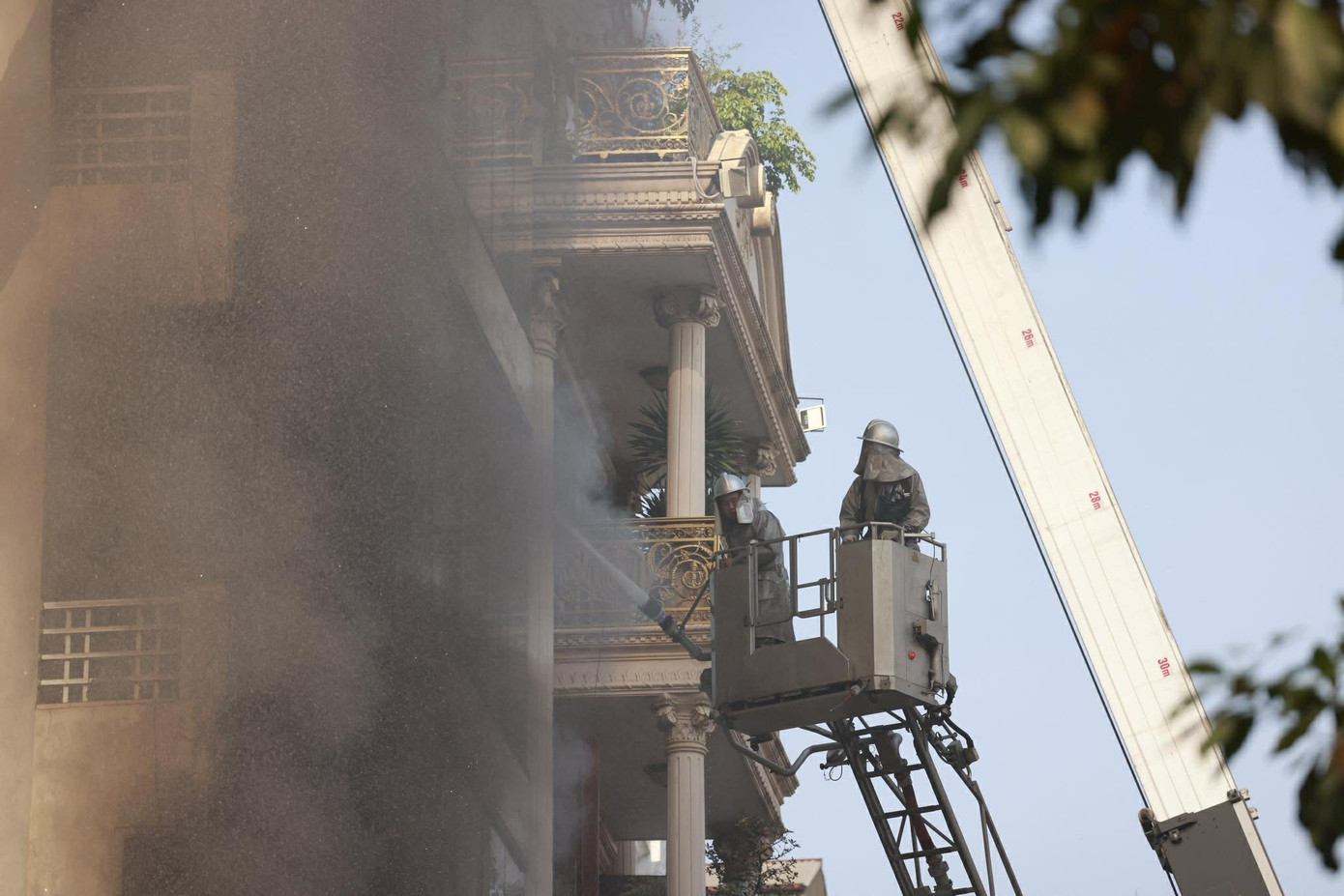 Xe thang cũng được điều động đến hiện trường làm nhiệm vụ. Hiện lực lượng chức năng đang khẩn trương chữa cháy, tìm kiếm cứu nạn.